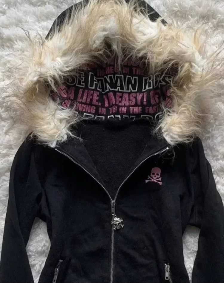Letter Skull Embroidery Zipper Hoodie
