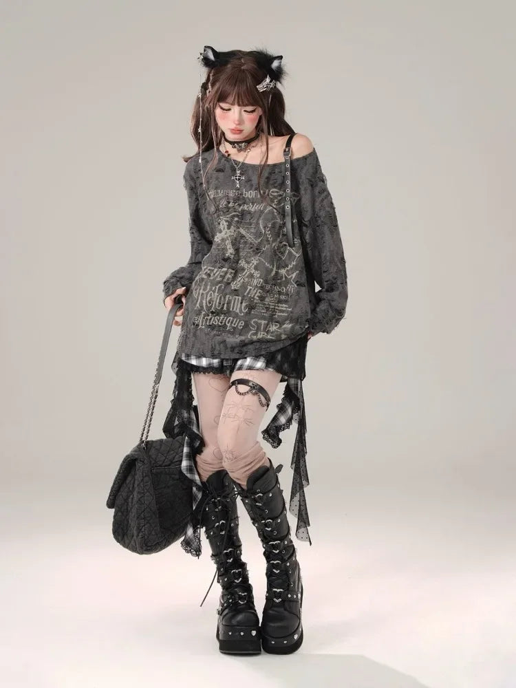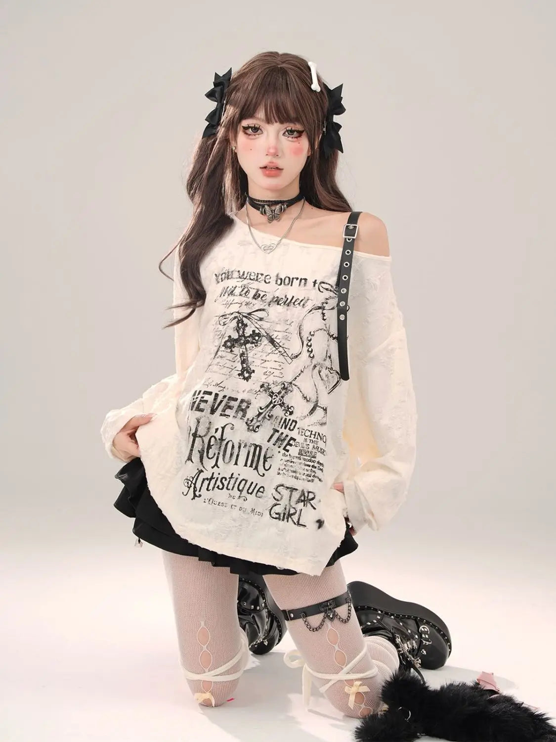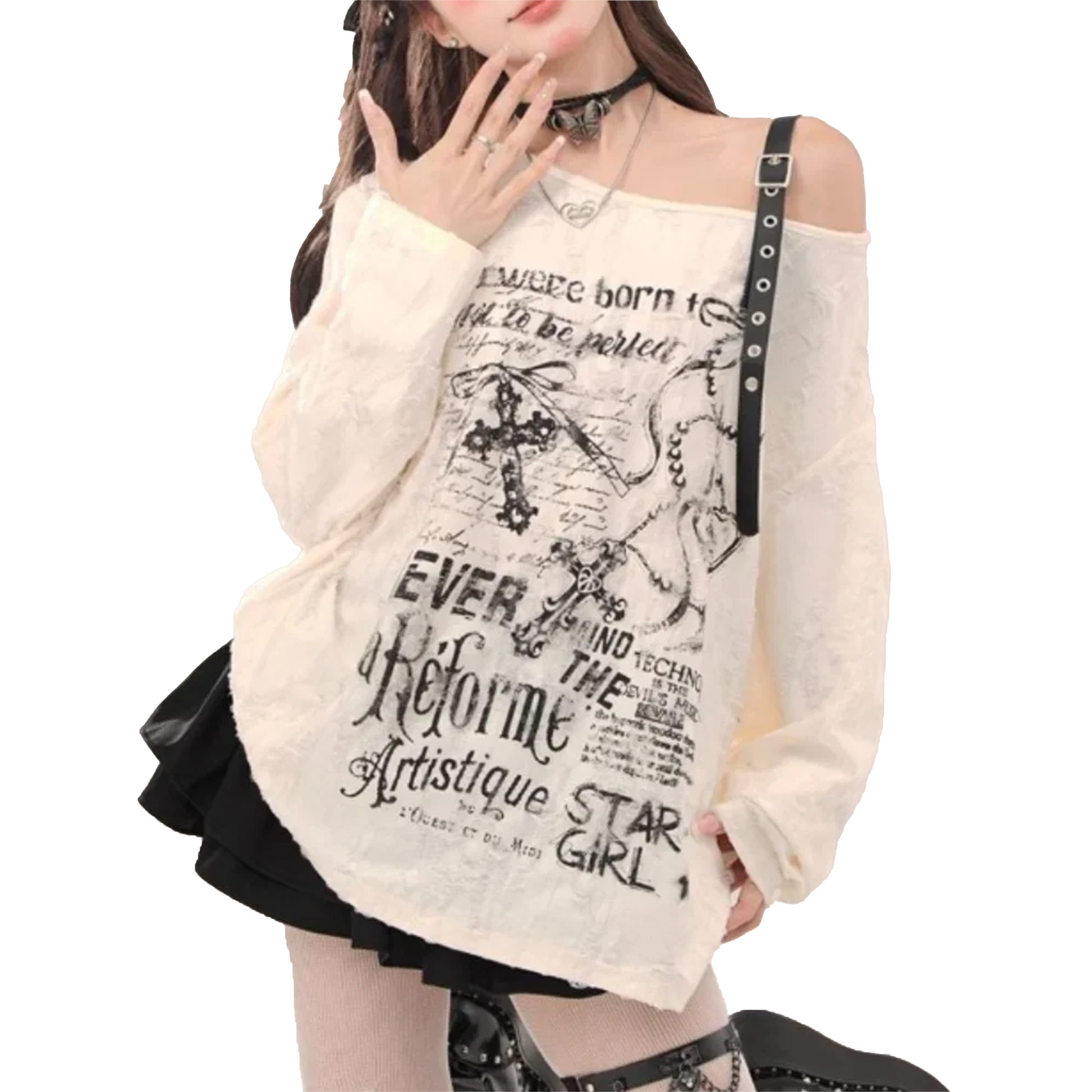 Gothic Cross Letter Graphic Off Shoulder Tops