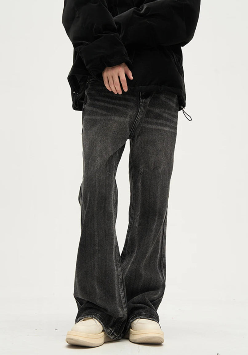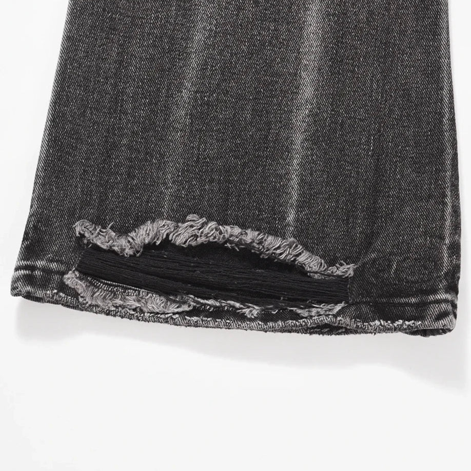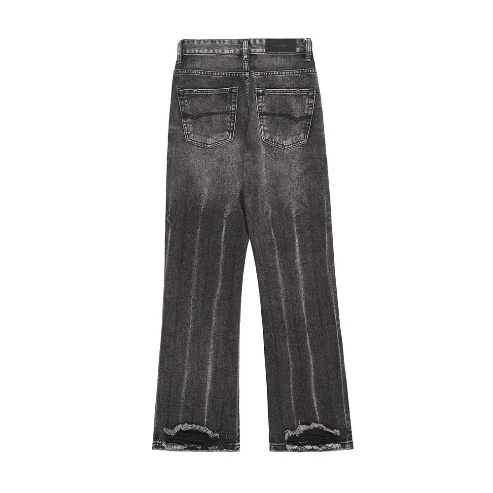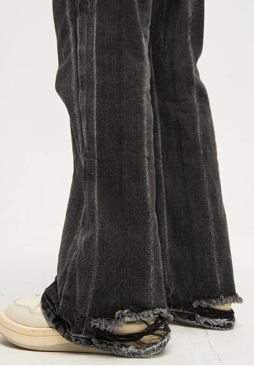 裾口のダメージ、ミディアムウォッシュ、フレアパンツ