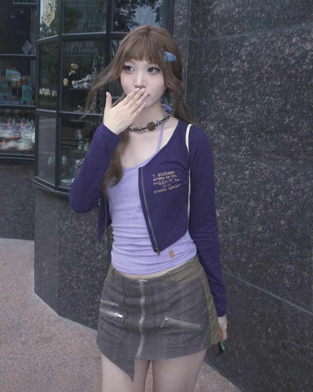 フェイク2ピーススリーブ、開閉タイプ: ジッパーフライ、レタープリント、結べるリボン